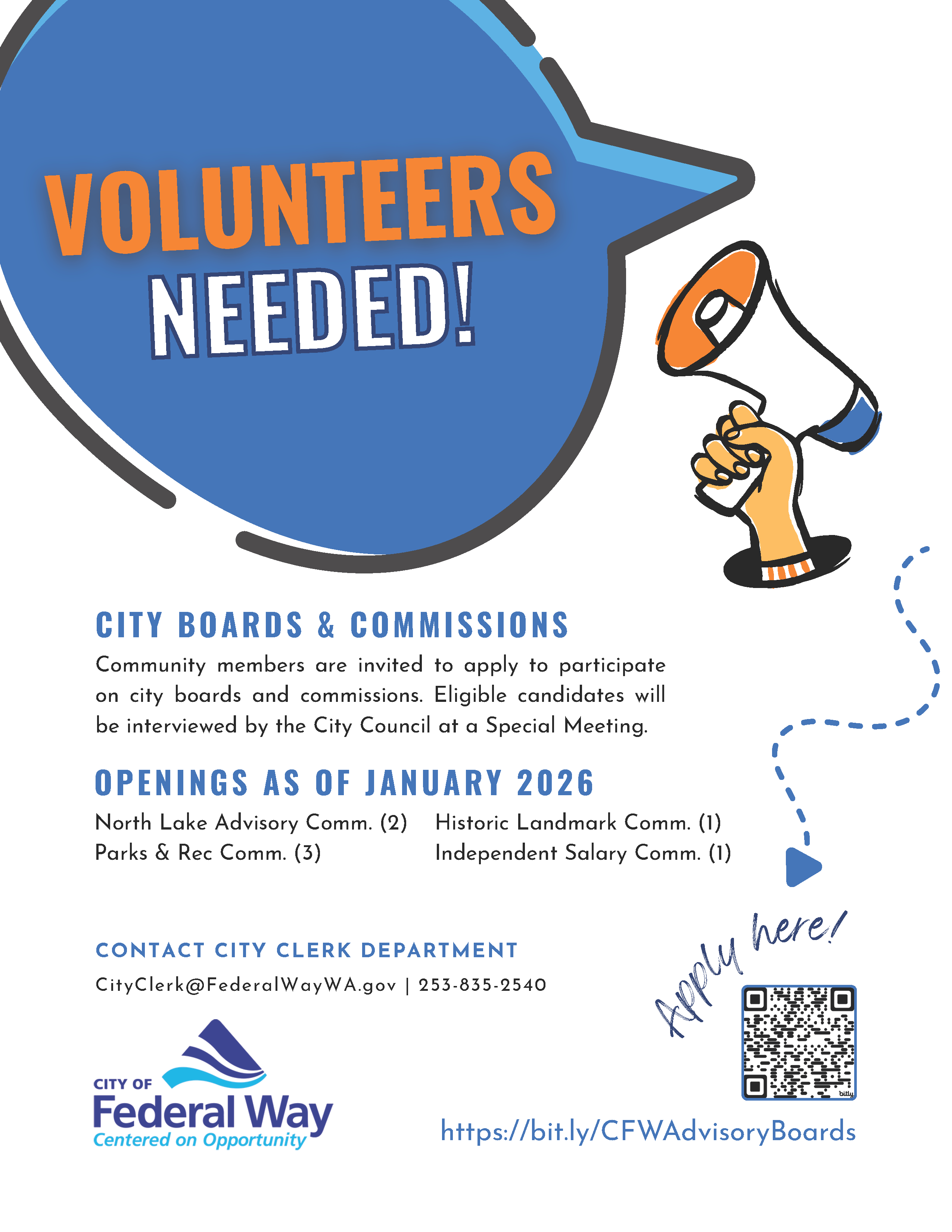 Eligible candidates will be interviewed by the City Council at a Special Meeting(s) to be announced. The City of Federal Way has several advisory bodies that advise the Mayor and City Council in certain areas of government policy and issues.