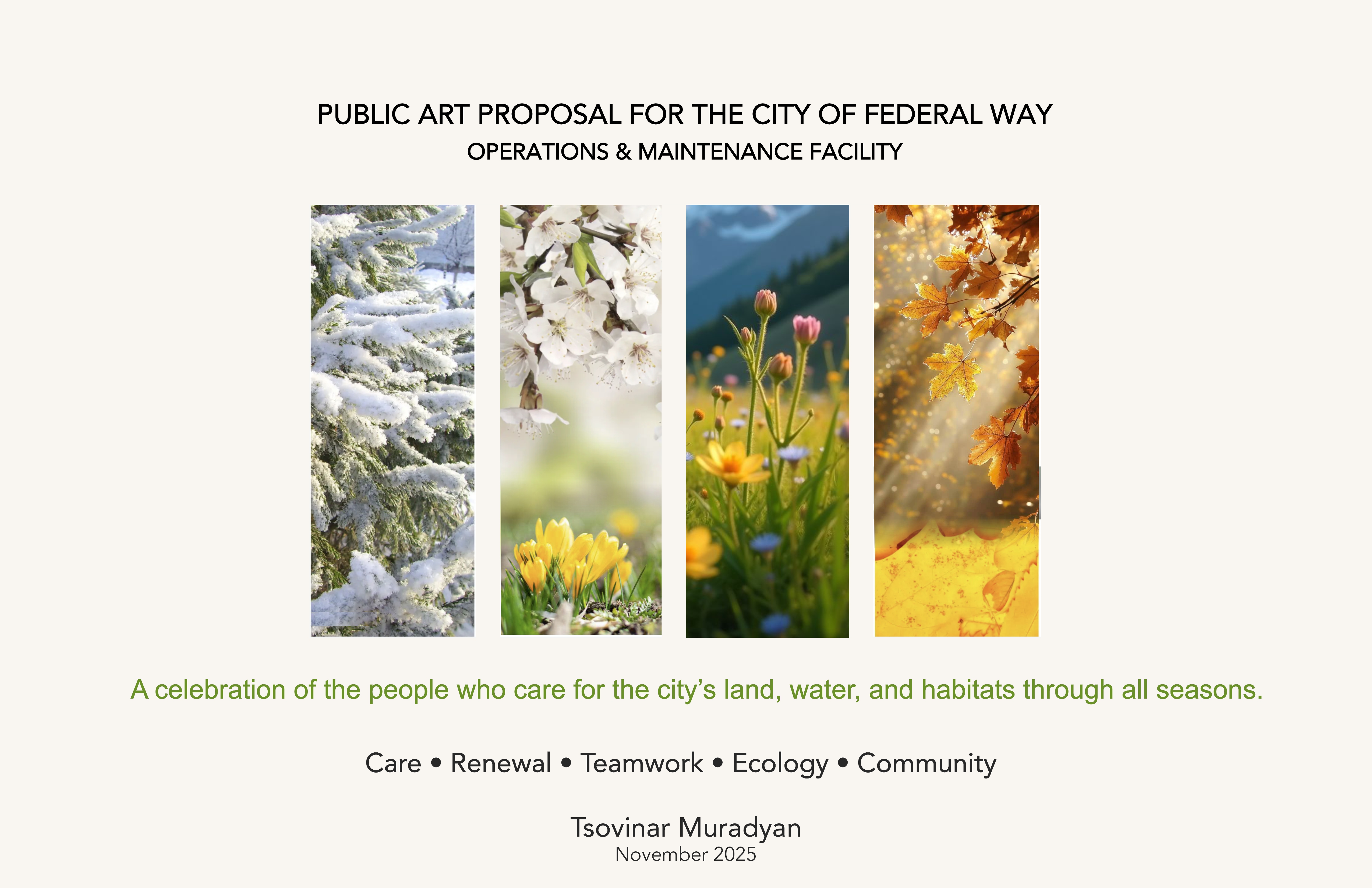 A committee of City staff and Arts Commission members has made a final recommendation to the City Council: βFederal Way Operations and Maintenance: Four Seasons of Dedicated Careβ by artist Tsovinar Muradyan.