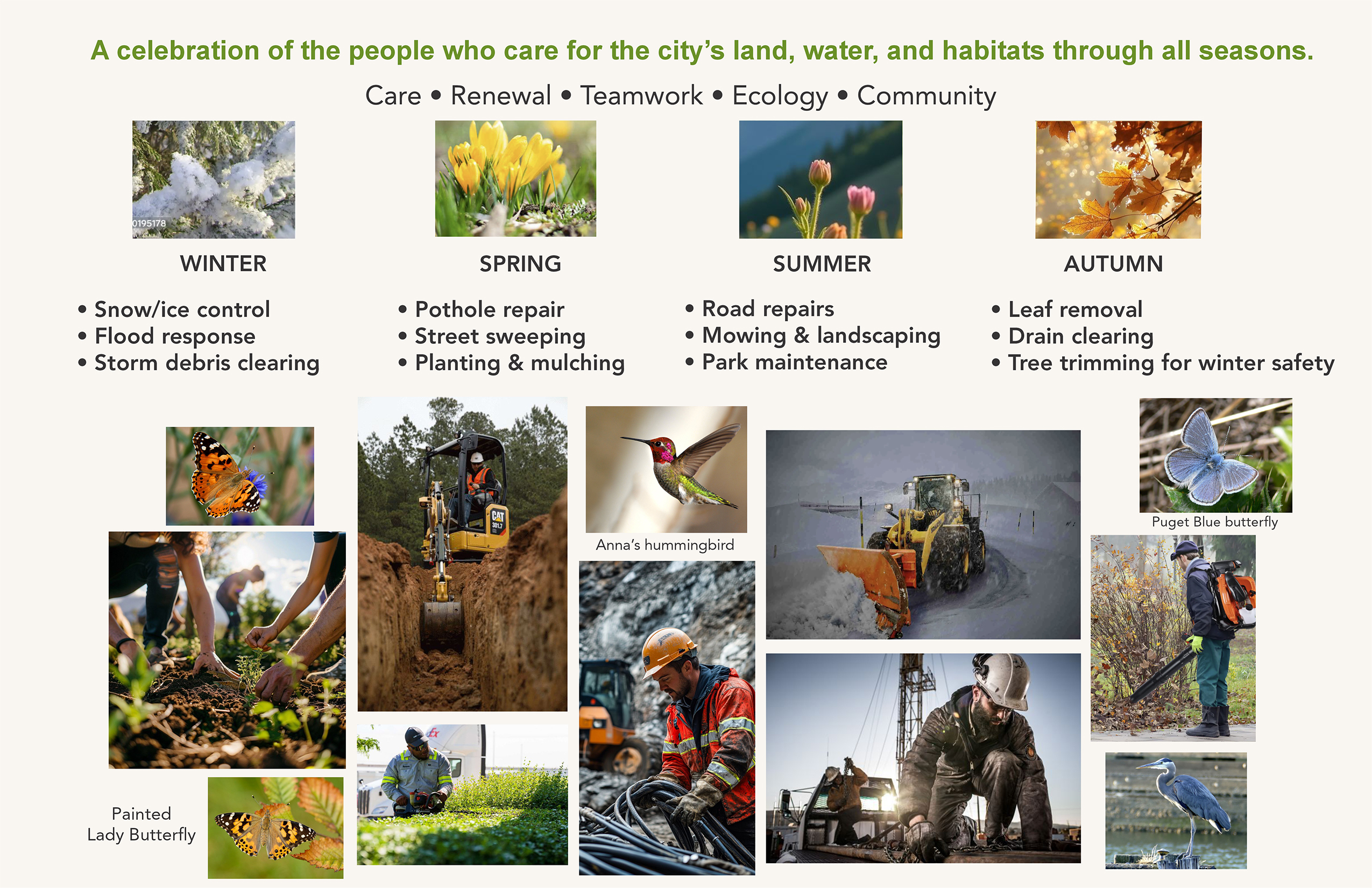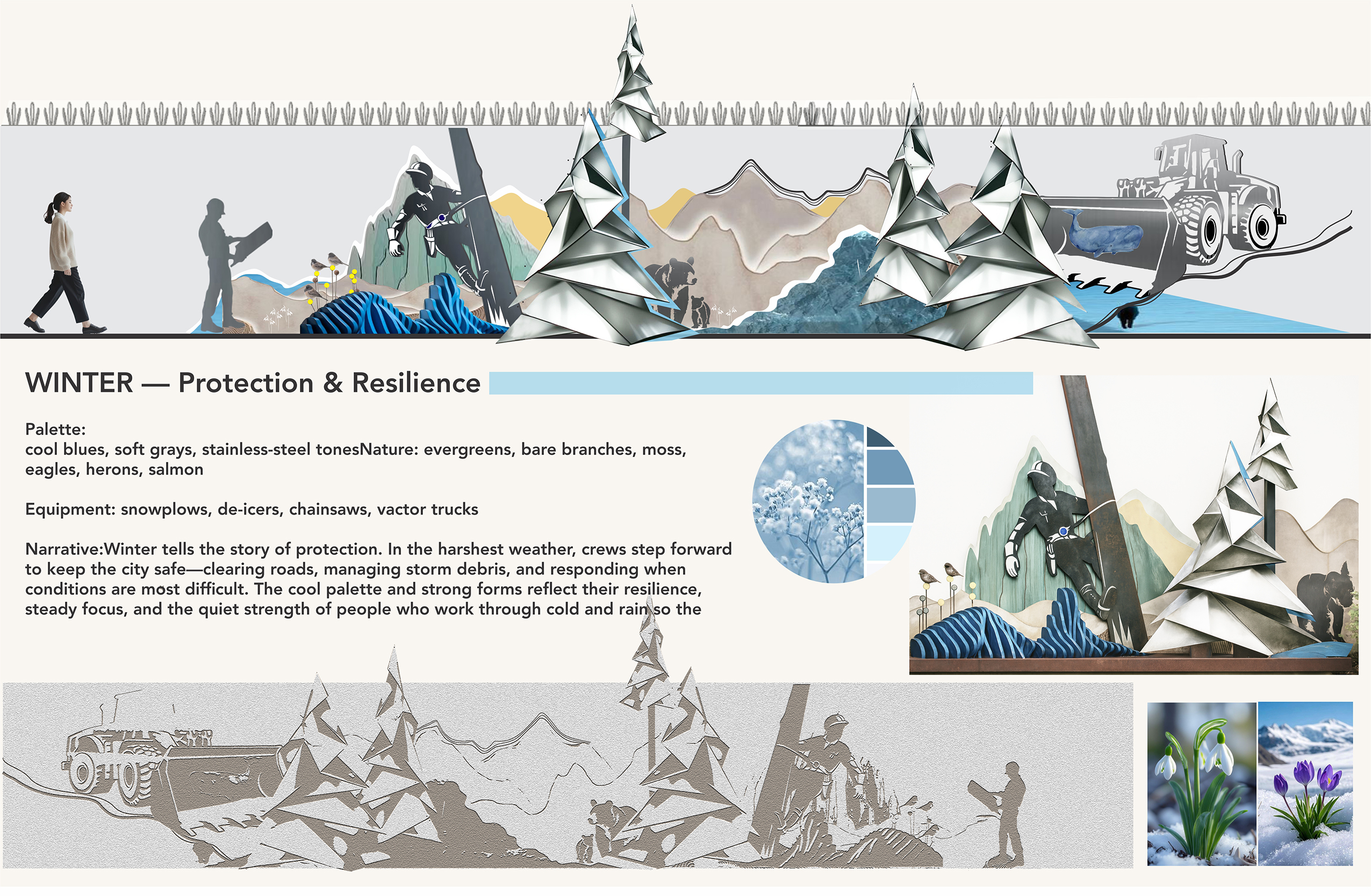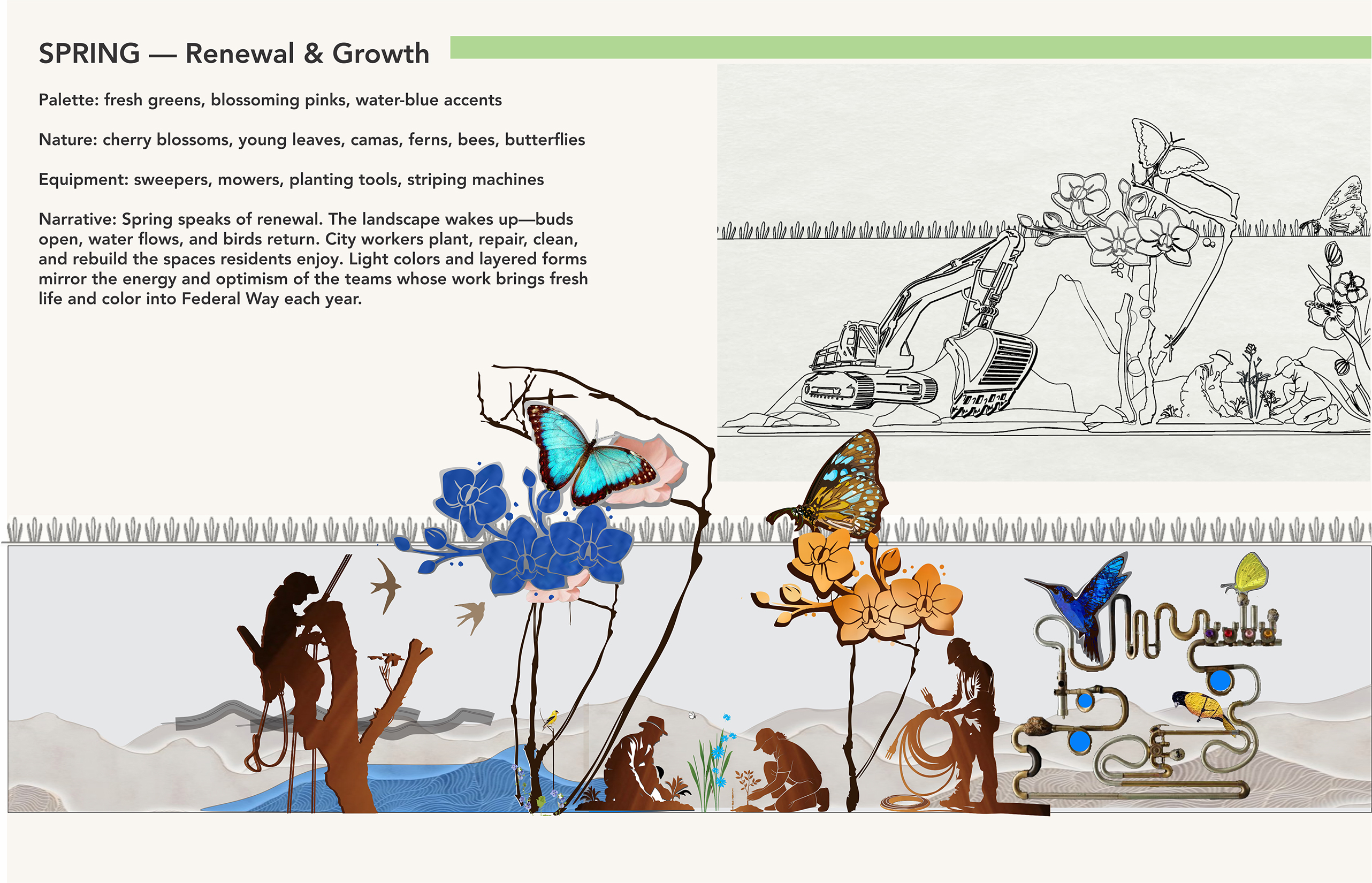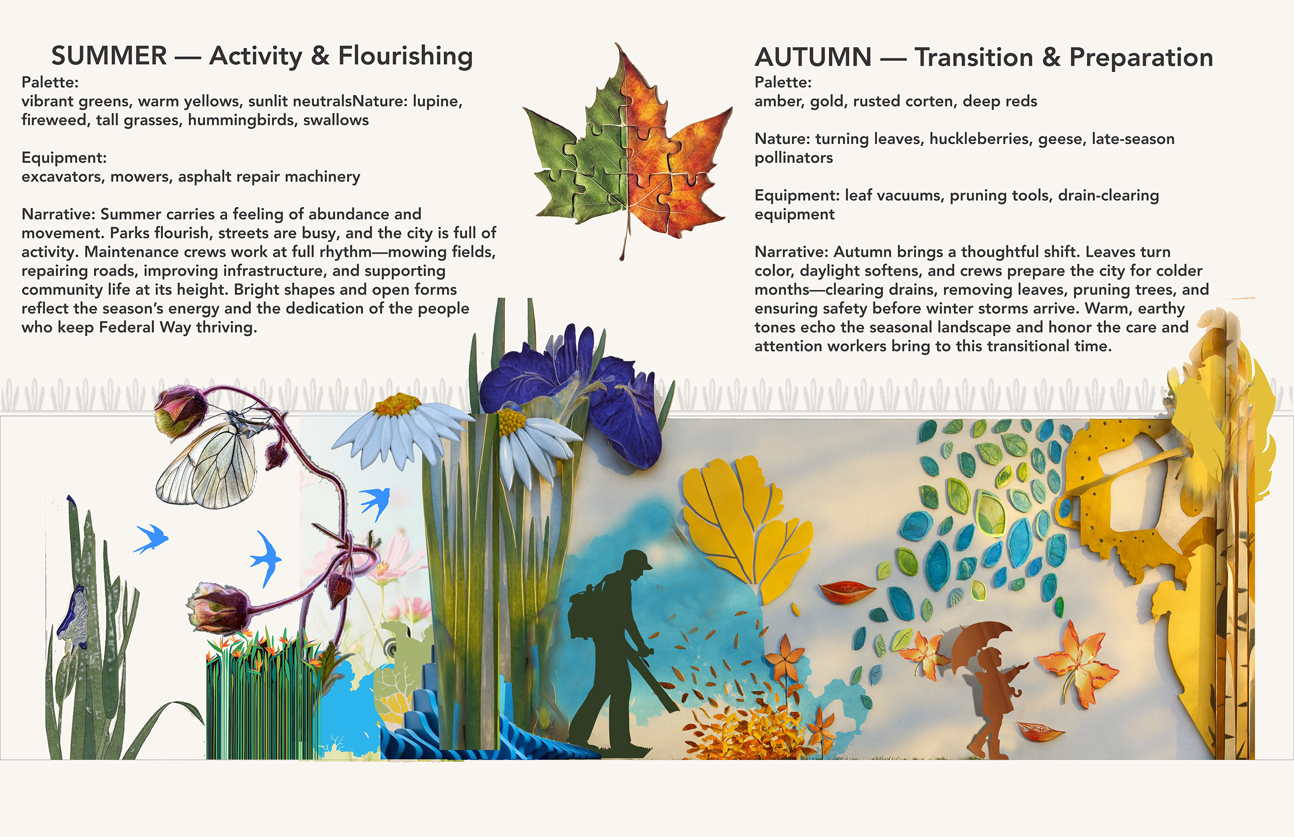 This artwork honors the Federal Way Operations & Maintenance teams for their year-round dedication that keeps the city cared for, resilient, and vibrant through every season.